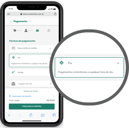 Para pagar com cartão de crédito, basta selecioná-lo como forma de pagamento ao término de sua aposta, informar todos os dados do cartão e clicar em “Finalizar Pagamento”. A aprovação pode ocorrer em até 20 minutos, após análise do antifraude. Uma grande vantagem deste meio de pagamento é que, uma vez utilizado, é possível realizar suas próximas apostas pagando com o cartão com apenas um clique.