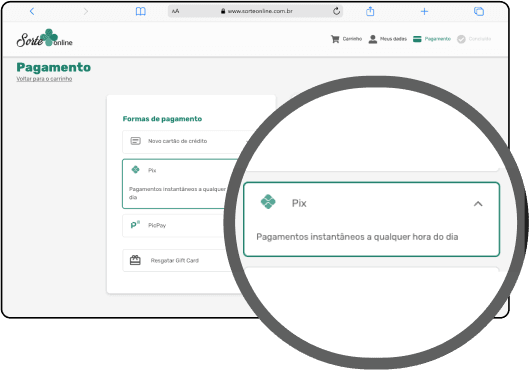 Dentre as formas de pagamento disponíveis, você tem a opção de usar os Créditos Sorte Online, que são adquiridos antecipadamente. Por meio desta opção, o usuário tem suas apostas confirmadas imediatamente, inclusive fora do horário comercial. Para a aquisição de Créditos Sorte Online podem ser utilizadas todas as demais formas de pagamento aceitas no site. Para pagar sua aposta com seus créditos, basta escolher seus jogos de valor menor ou igual ao crédito e selecionar essa opção como forma de pagamento ao final de sua compra.