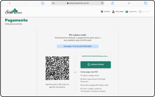 Para pagar com Pix no computador, basta selecionar essa opção como forma de pagamento ao término de sua aposta e usar o QR Code que aparecerá na sua tela. Para isso, é necessário abrir o aplicativo do seu banco ou carteira digital no smartphone e escanear o QR Code. Os detalhes da transação serão exibidos na tela e você poderá finalizar a operação no seu celular.